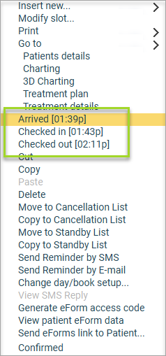 A patient and time tracking feature found by right clicking on the appointment. Mark an Appointment as Arrived, Checked In or Out Right click on patients appointment Click action needed, e.g. Arrived Arrived: This indicates the patient has arrived ...