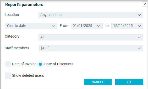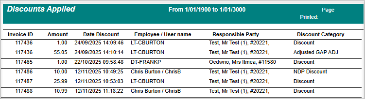 - Show deleted users: Tick box to show any discounts they may have been issued by a now deleted user
