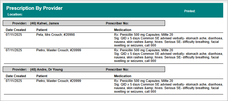 Prescriptions issued within a period of time, with ability to group report by Providers or by medications prescribed.