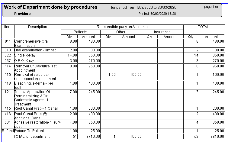 The No Quote/Planned Treatment Performed report will show all patients that had items entered into Treatment that were not transferred from a Treatment Plan.