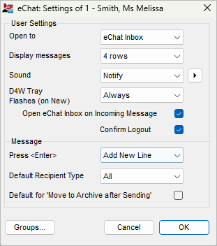 Default Recipient Type: Select the recipient type already selected when creating a New Message: All, Users, eChat Groups, D4W Groups