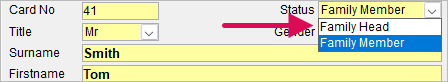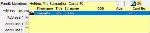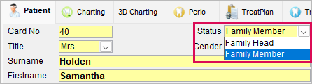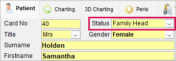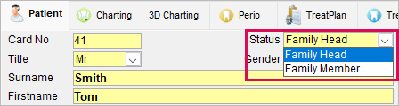 - Family: A patient exists in the database alongside family members and is the family head of the family file. A crown will be shown next to the family head in the Family Members drop list