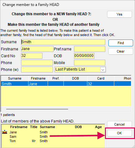 (or Ctrl + F) - Enter the name of the existing patient (head) you wish to link the new patient (member) to