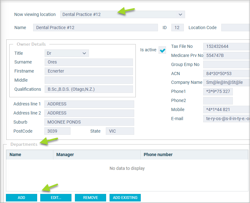 The Practice Location and most information was setup at initial install time, however the location page also allows the approved user to edit, add ABN's, Logos & letterheads, departments etc