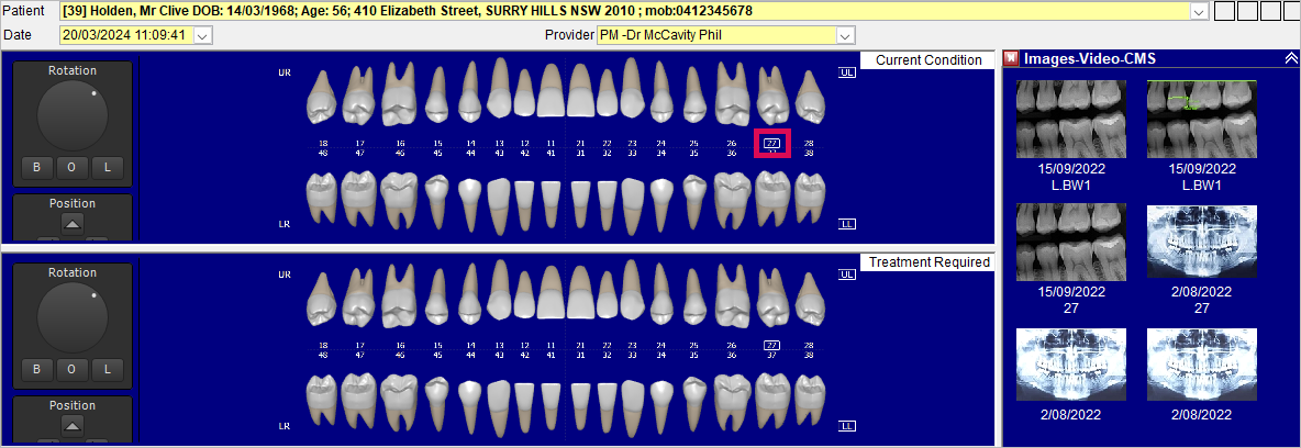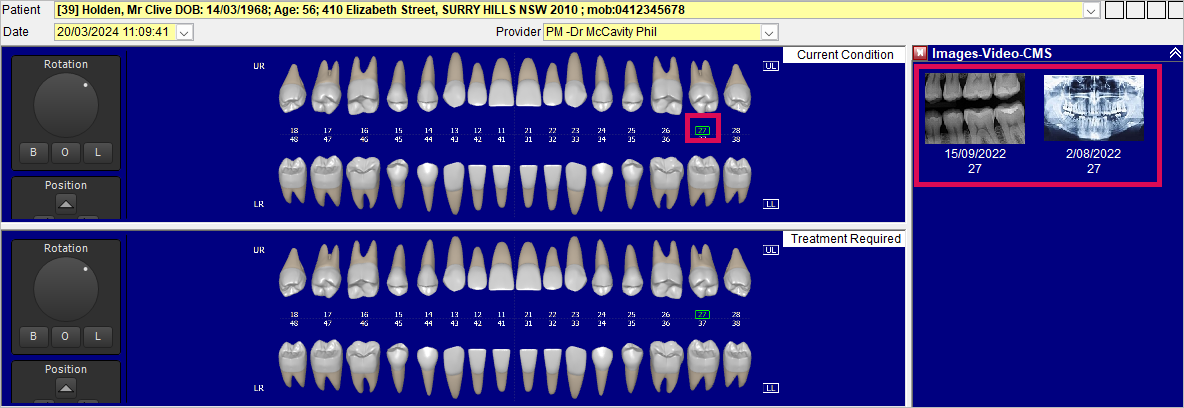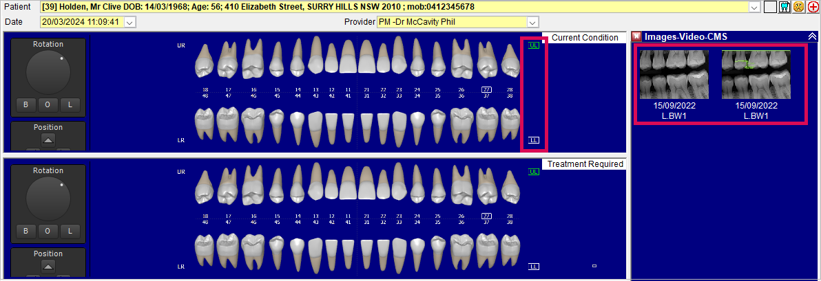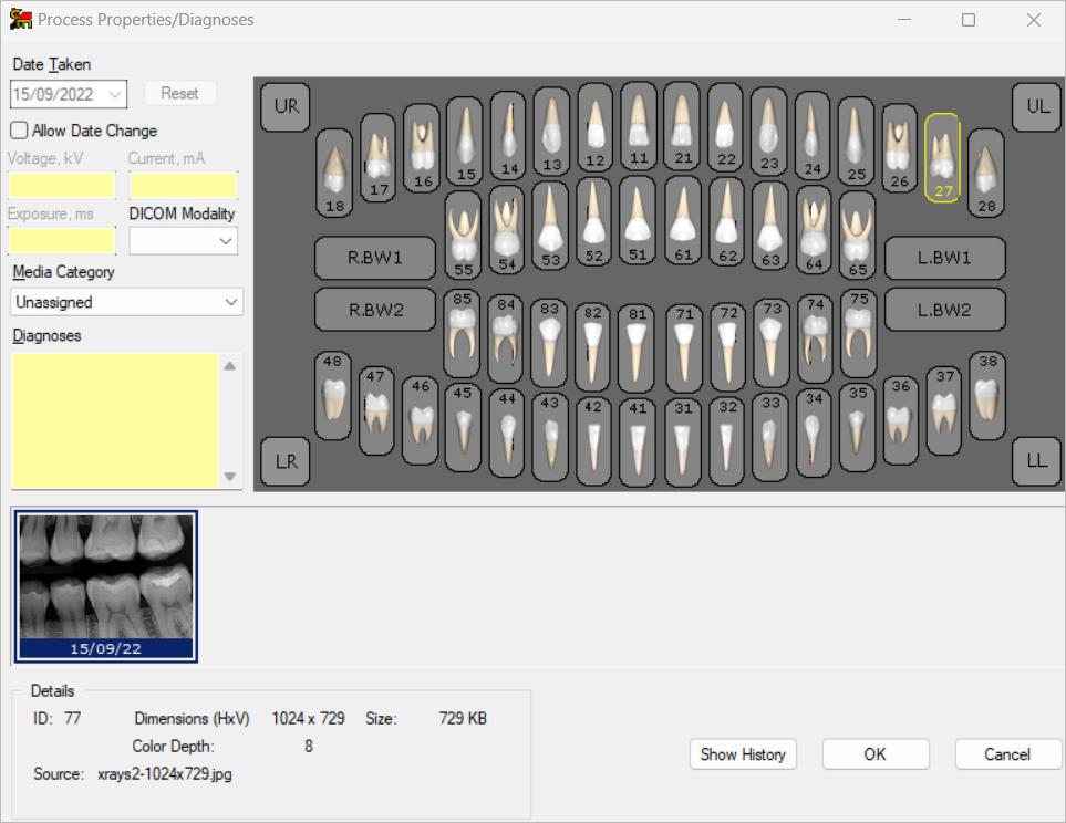 Within the Properties/Diagnosis page images can be linked to tooth number, quadrant or bitewing.