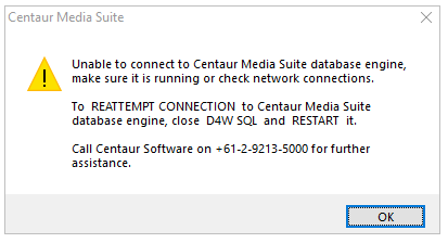 - Next try closing and re-opening D4W. If an error appears saying Unable to connect to Centaur Media Suite database engine