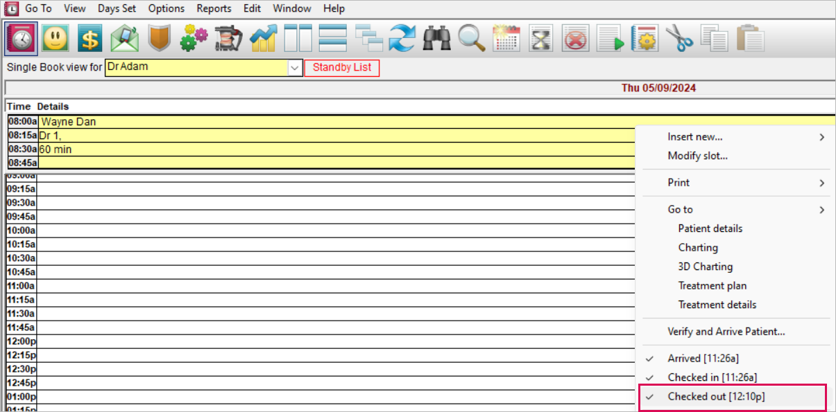 - Go to Appointment Book > right click on patients booked appointment > Checked Out