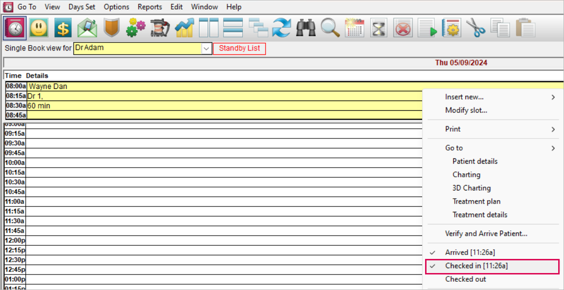 - To reverse Checked out status, right click patients appointment and click ticked Checked out