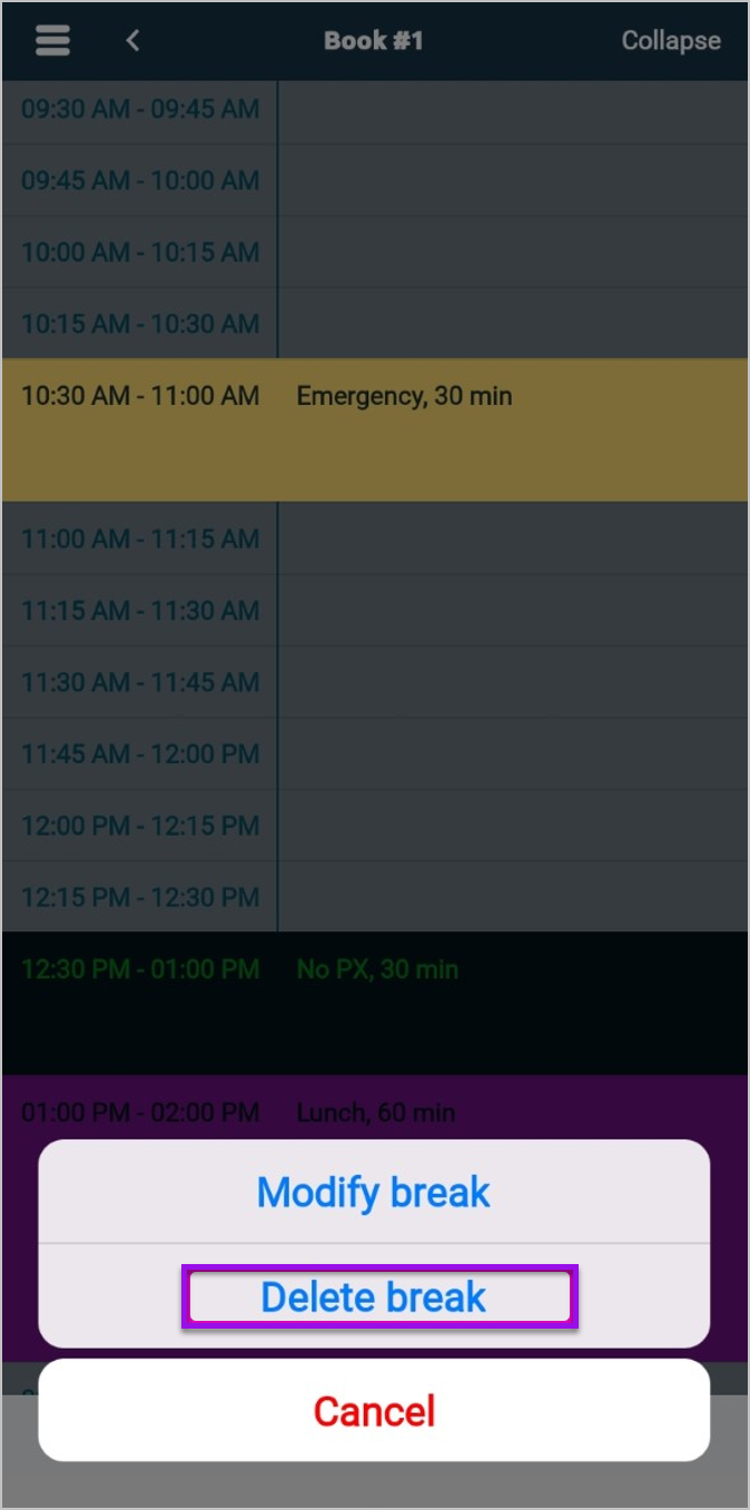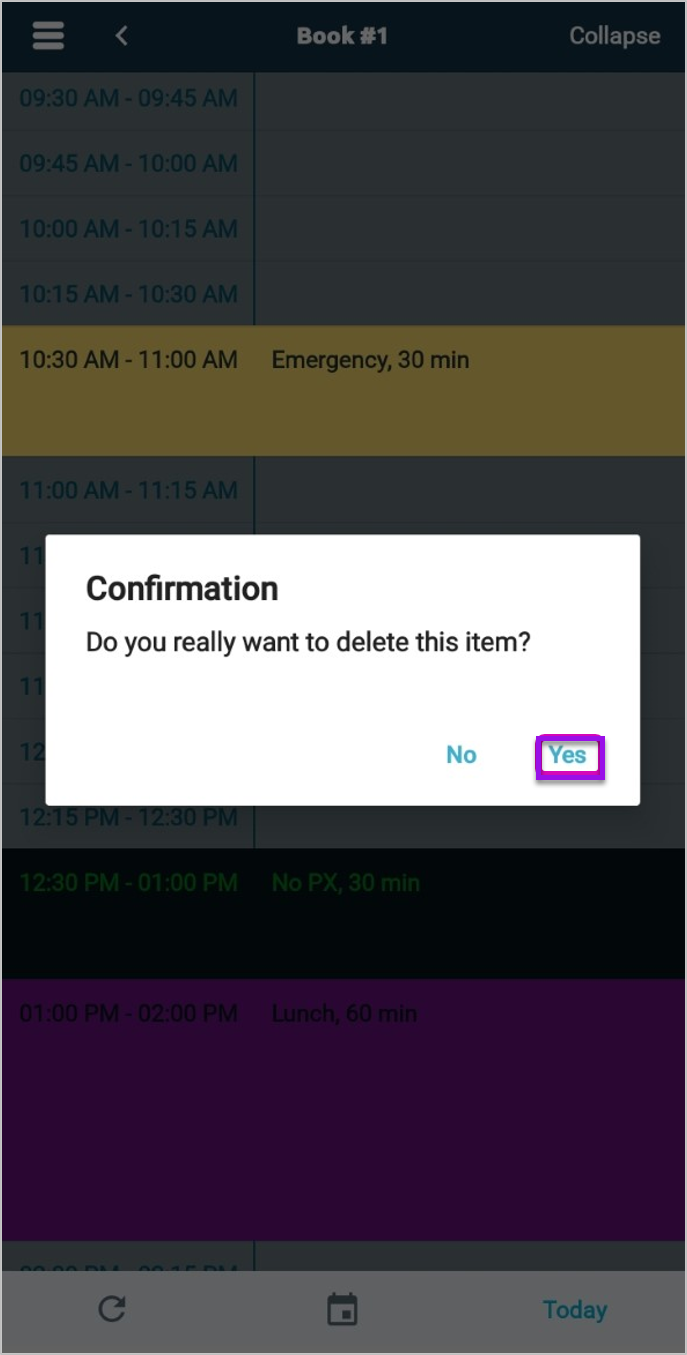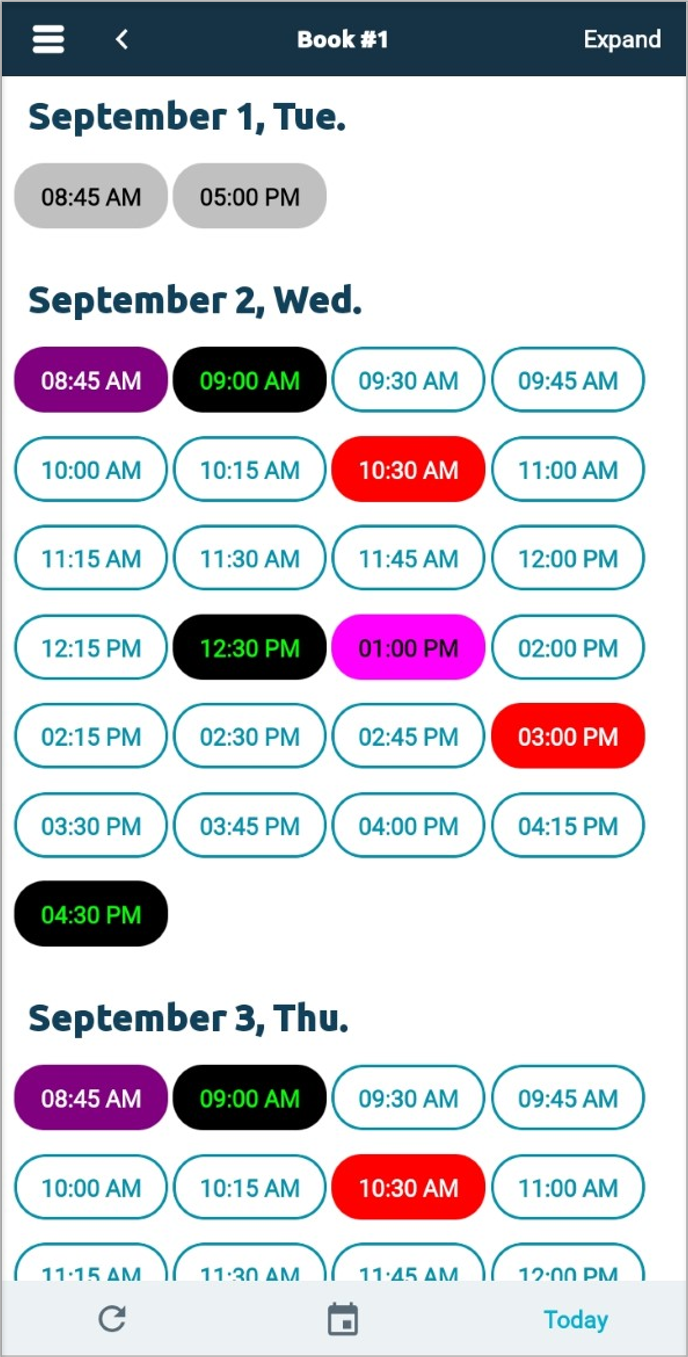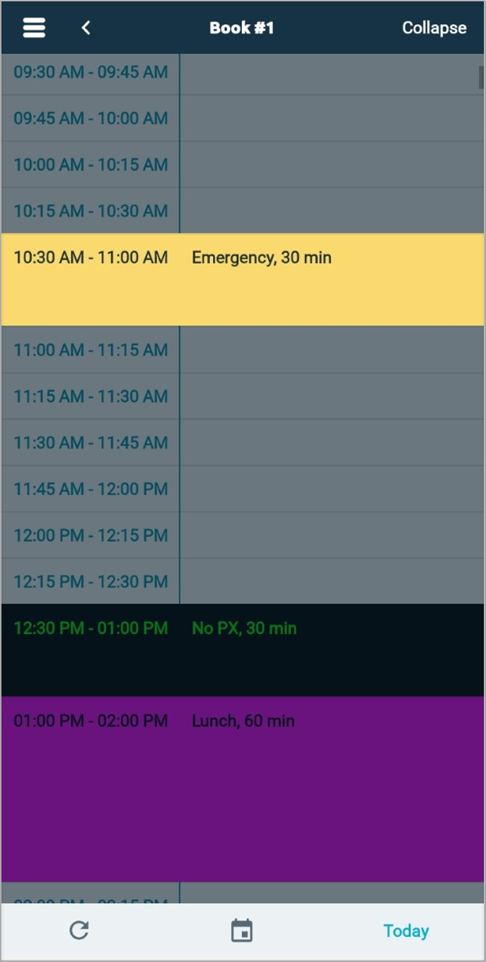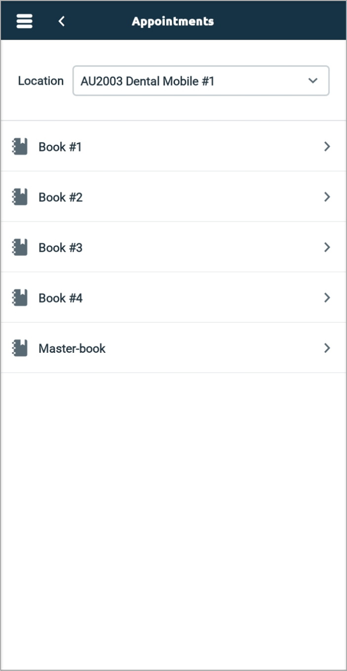 - To navigate through the different Appointment books you can either tap the < arrow to go back to the main screen or use swipe <left or right> to move to the previous/next Appointment book or select book from the hamburger menu