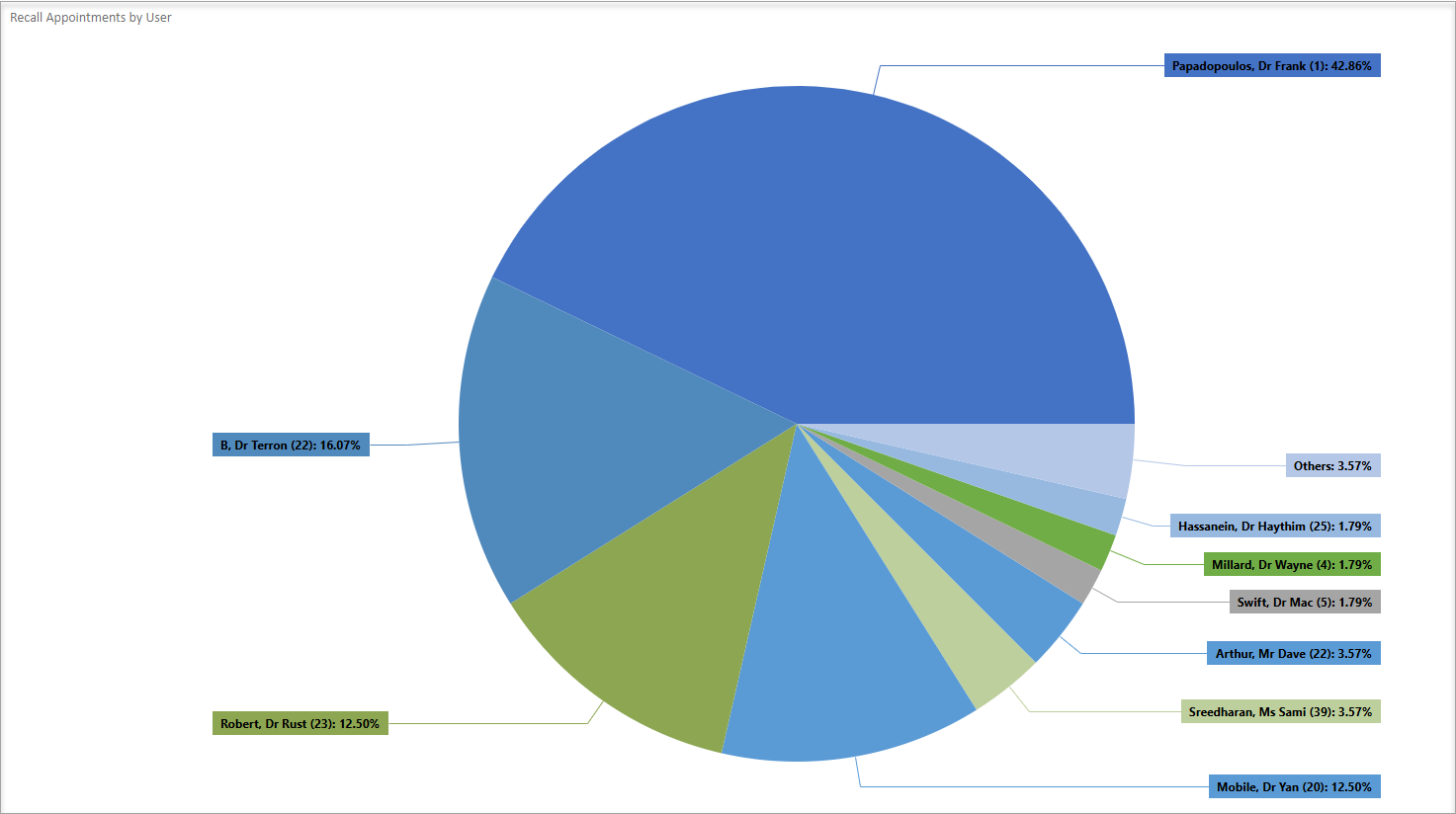 - Recalls Sent – All the recalls sent within during the period / Recalls Booked – Of the patients that received a recall, the number of patients that booked a recall appointment within the same period