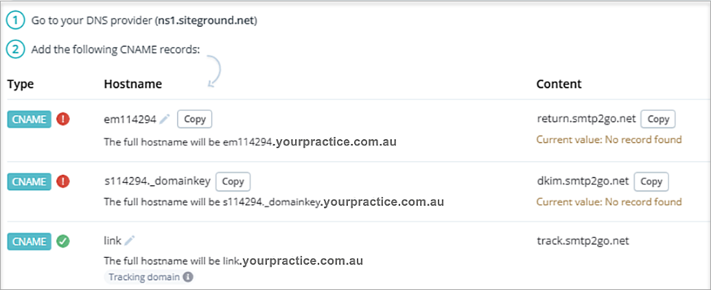 Simple explanation: A CNAME record is like a permission slip that tells email systems: “This practice has authorised SMTP2Go to send emails on their behalf.”