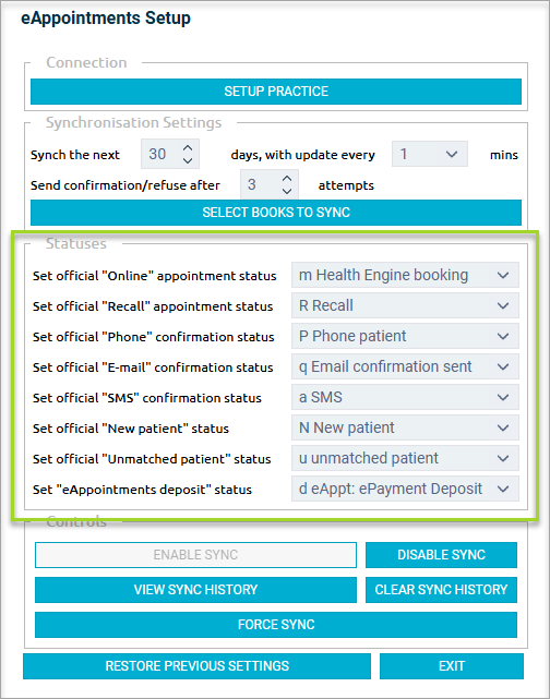Once a Status is created, some can be linked to patient appointment types (e.g: Arrived, FTA/UTA, New Patient, eServices)