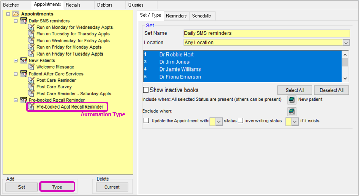 - Select the type Pre-Booked Appointment Notifications (sometimes this can be called Recall Appointments)