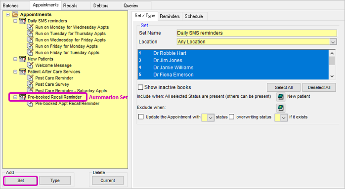 A default list of commonly used automated actions exist within Dental4Windows, however more can be added. Adding a new Set is a way to group a set of automated actions, for example, all daily appointment confirmations should sit within the one Set.