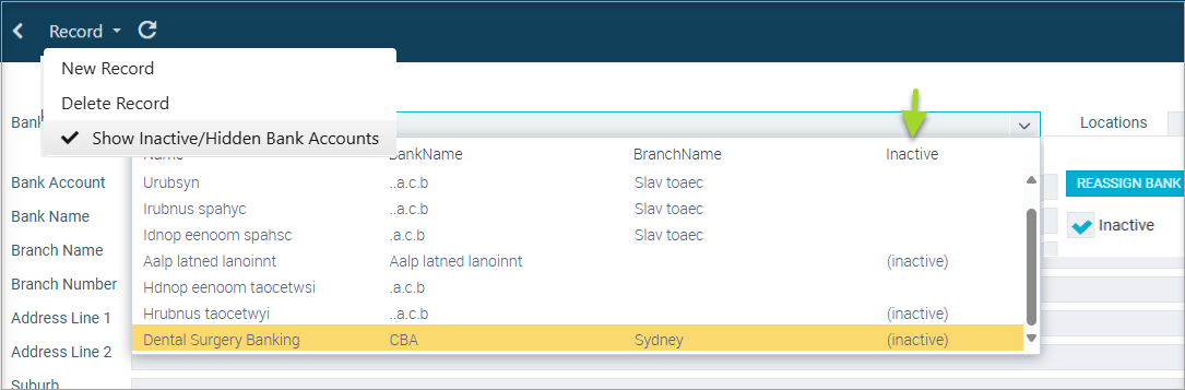 - Click Record menu > Show Inactive/Hidden Bank Accounts