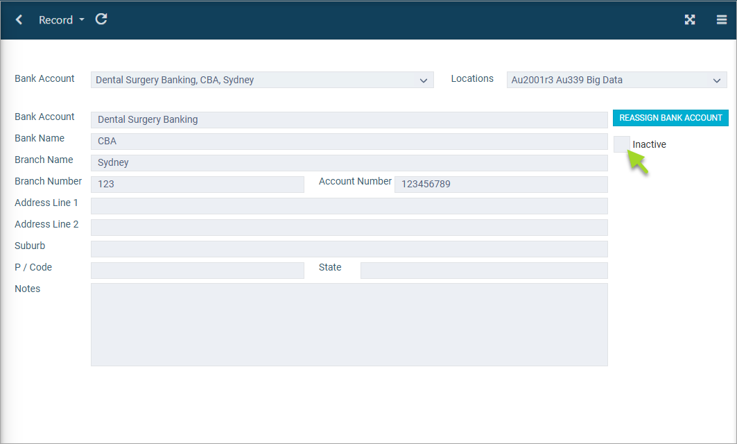Below is how to Add New Bank Account, Reassign Bank Account to Another Location and Make Bank Account Inactive (hidden). Add New Bank Account Go to Location Setup > Bank Accounts tab Record menu > New Record / Click New Record icon Enter the bank ...