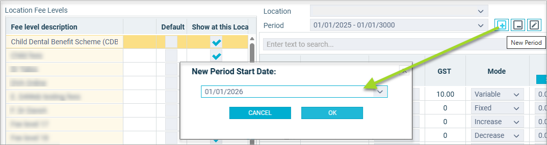 - Add a new Fee Period Start Date: Enter the date the fees will become effective = 01/01/2026