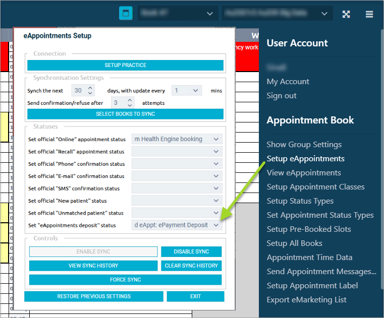 - Select the created Status from the menu next to Set ''eAppointment Deposit'' Status