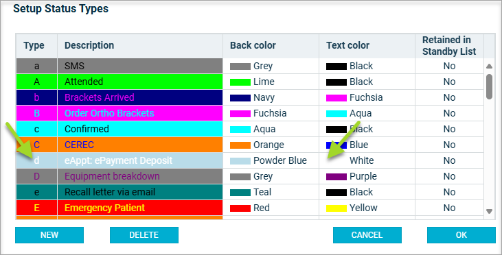 Go to Appointment Book, Options drop down menu > Setup Status Types
