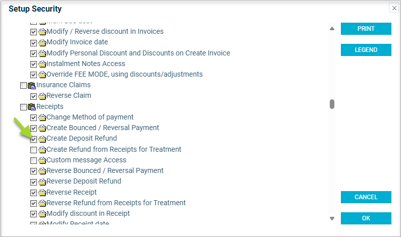 Enabling this security feature will either allow or disallow a user to issue refunds for an eAppointment Deposit from either Appointment Book or Receipts page.