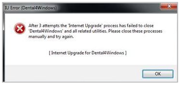 After 3 attempts the 'Internet Upgrade' process has failed to close 'Dental4Windows' and all related utilities. Please close these processes manually and try again.