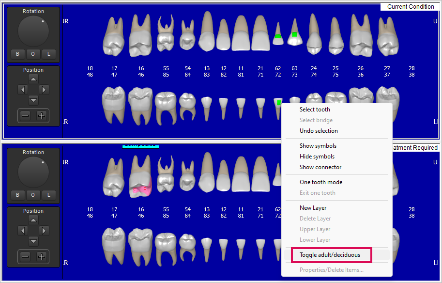- Individual teeth can be rotated by right clicking on the tooth > Select tooth