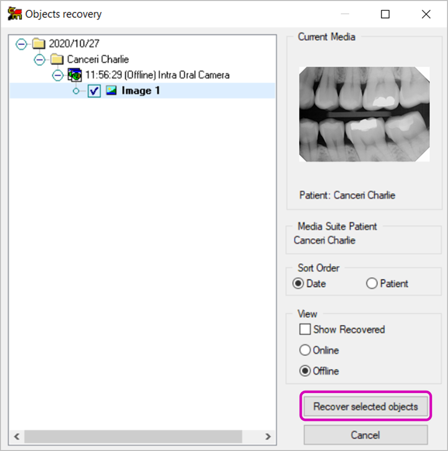 If a patient's name entered into CMScan while in Offline Mode does not match the patient's record open in Mediasuite, CMScan Image Recovery generates a prompt. For example: the patient Charlie Canceri is entered into CMScan as Charlie Cancerri.